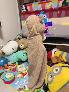 最後に、お風呂あがりの牛乳が「格別な1杯」の息子の後ろ姿です(笑)