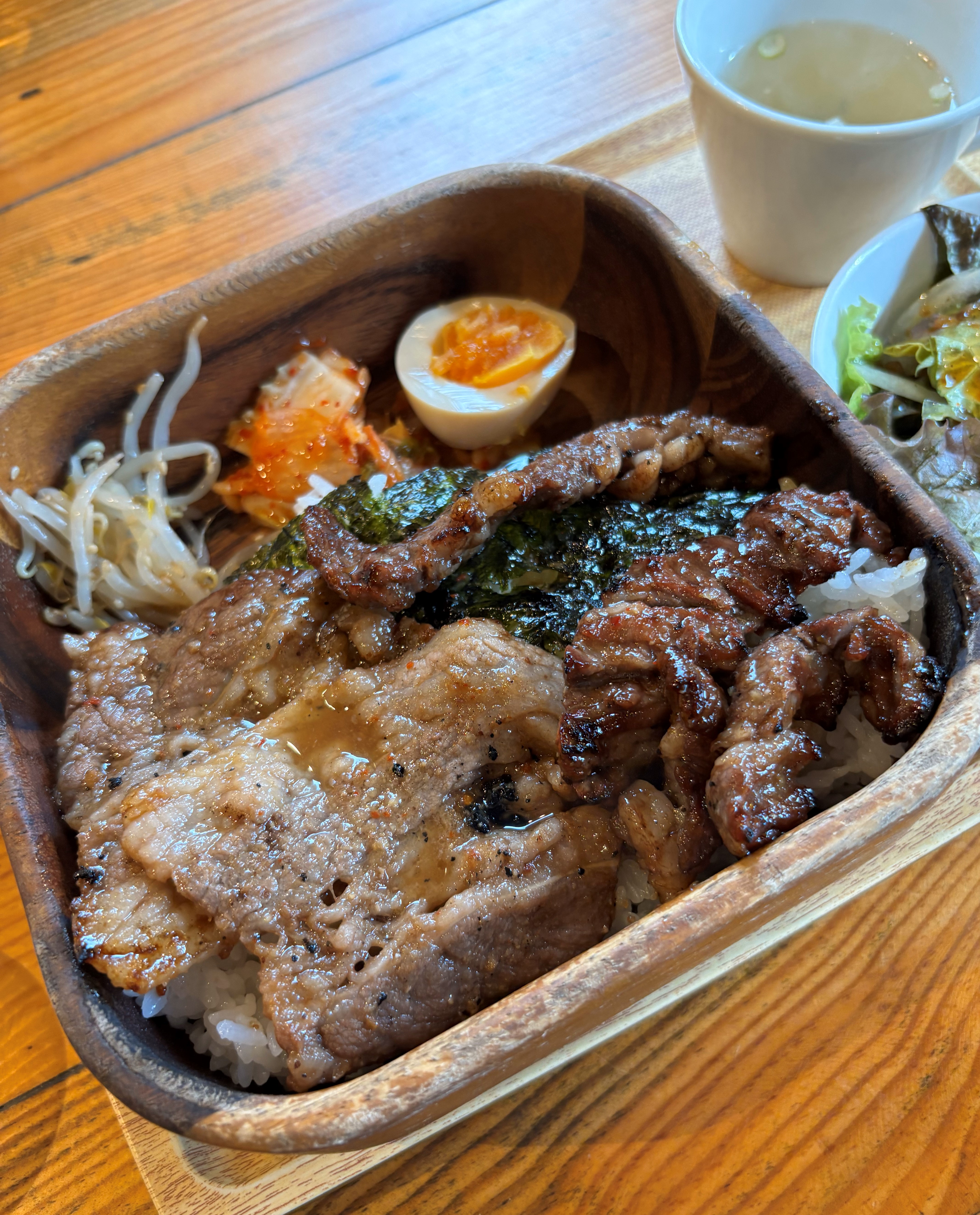 付け合わせにはもやしのナムルとゆで卵、キムチがあります!