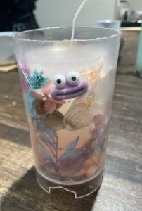 キャンドルの周りの飾りが完成したら、ロウを流し込み冷蔵庫で冷やします