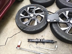 車載工具でタイヤの空気圧を調整し、ジャッキアップして取り付け。