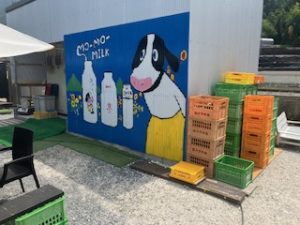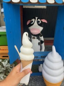 かわいい牛のイラストと綺麗な巻きのソフトクリーム等が食べられます。