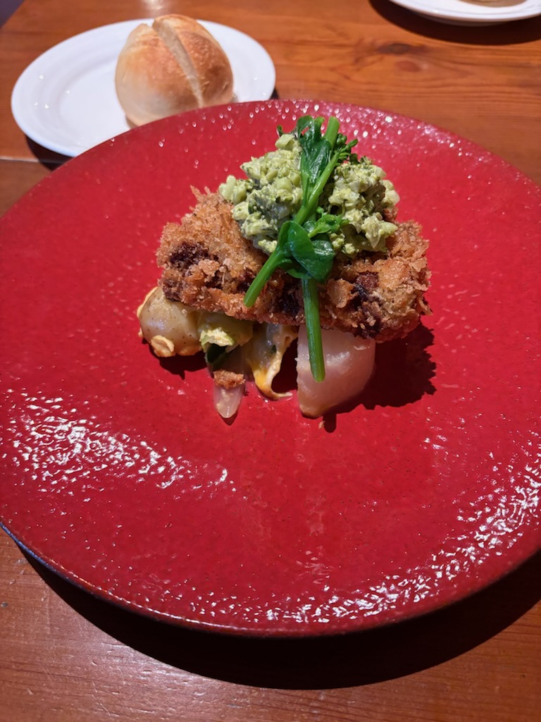 👆豚肩ロース肉のコートレット・グリーンタルタルソースと自家製パン🥖
