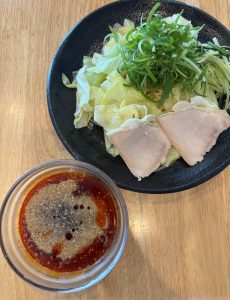 つけ汁は醤油ベースで唐辛子、ラー油、胡麻などが入っていて、