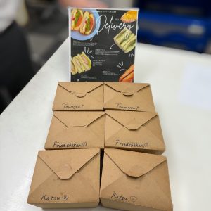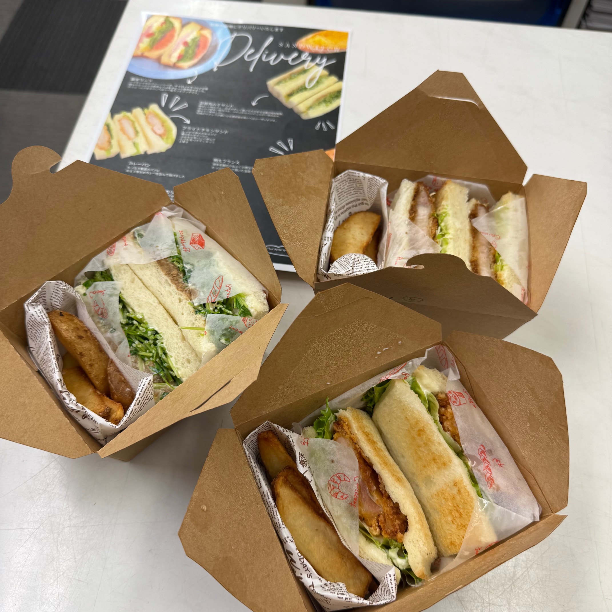 左が豆苗肉みそサンド、下がフライドチキンサンド、右上がカツサンドです🥪