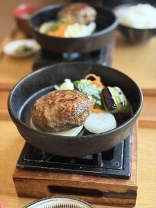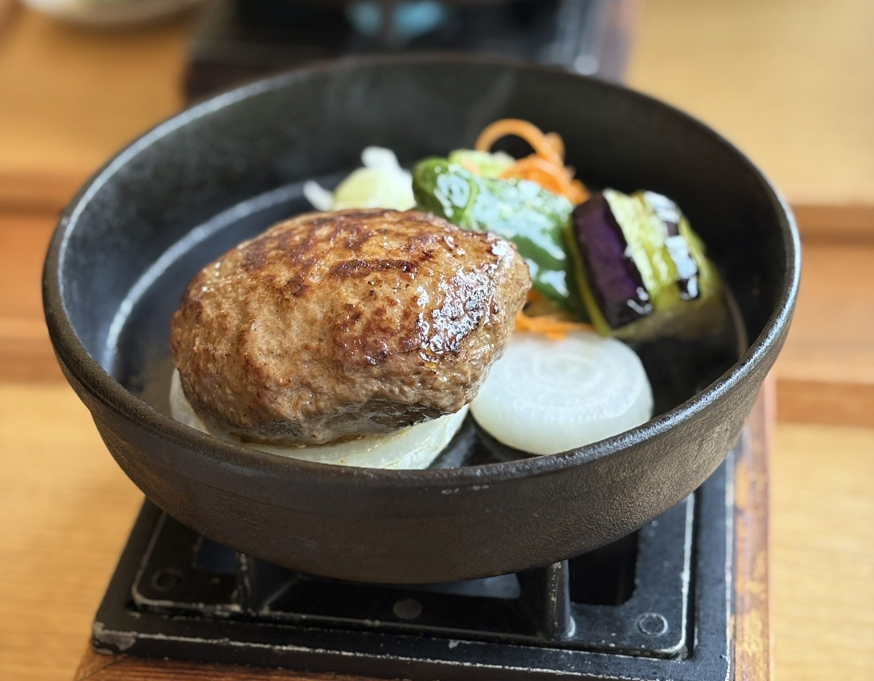 ハンバーグは肉汁たっぷりで、付け合わせの野菜も甘くて