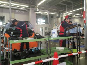 競技時間は35分間。検査員1名、作業員2名で作業し、それぞれの個人採点とチームの総合得点を競います。