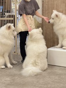 店員さんにおやつをもらうときはきちんとお座りしていて