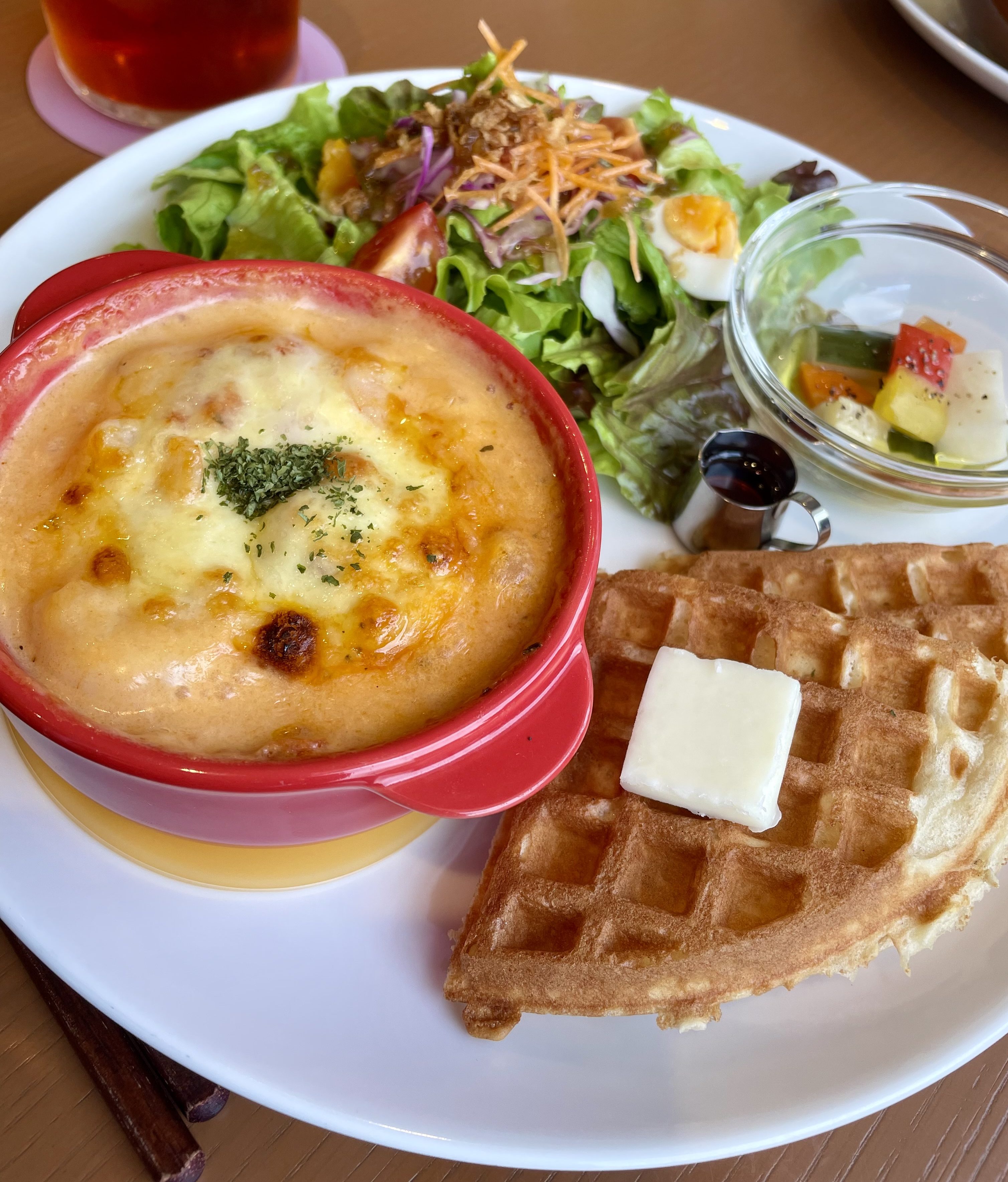 猫舌なので熱々なグラタンをホフホフしながら、フワフワのワッフルも😚😋