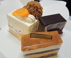 11/15なかしま、My Birthdayだったんです🤭🎂事務員4人でお昼ご飯を食べていると、1人のスタッフが席を外しました👧👋戻ってきた手には白い箱が😲😲!!そう!ケーキを買ってきてくださったのです😭😭🍰とても高級感が漂っていました!!ケーキ本来のお名前がかっこよかったのですが、忘れてしまいました。柿が乗っているショートケーキ・ラム酒入りのモンブラン・木苺入りのチョコレートケーキ・洋梨のムースジュレケーキを買ってきてくださいました🌰🍐🍰どれも美味しそうですよね😋💖