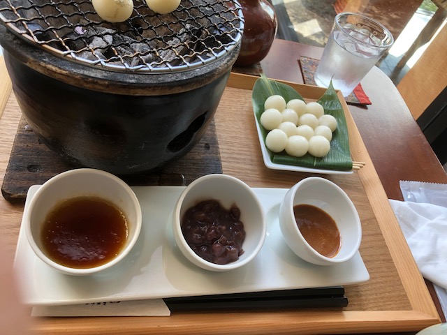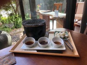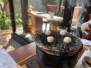 こちらの店舗では写真の通り!自分で七輪の上で団子を焼き3種類の味付けを 楽しむことができるのです(*^^)v