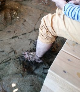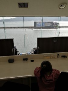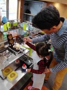 まずは、もみじ饅頭の手焼き体験がしたいと言うので