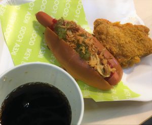 ホットドッグが80円で、チキンと飲み物のセットでも350円!しかも飲み放題という