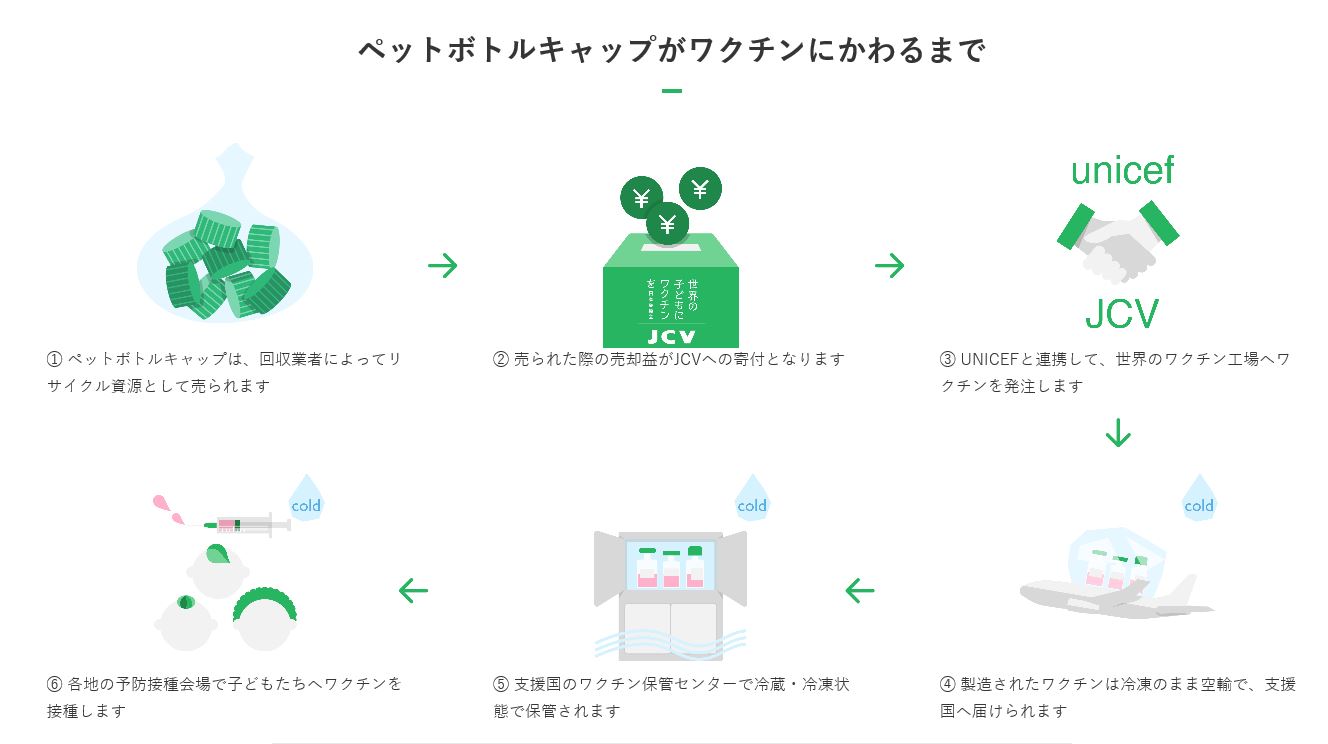 集められたキャップはリサイクルされ、そのリサイクル資源が売られた際の利益が寄付される仕組みになっています。