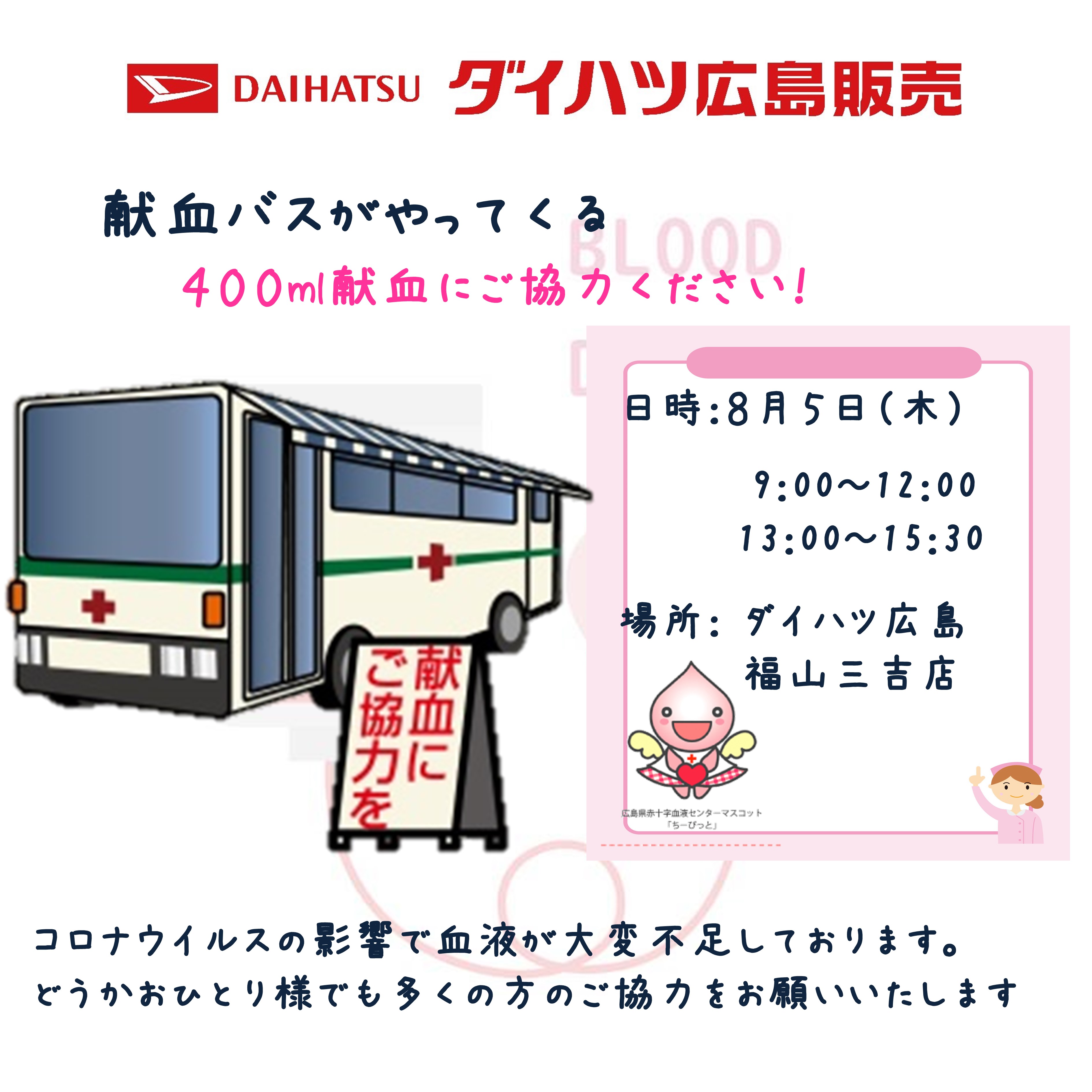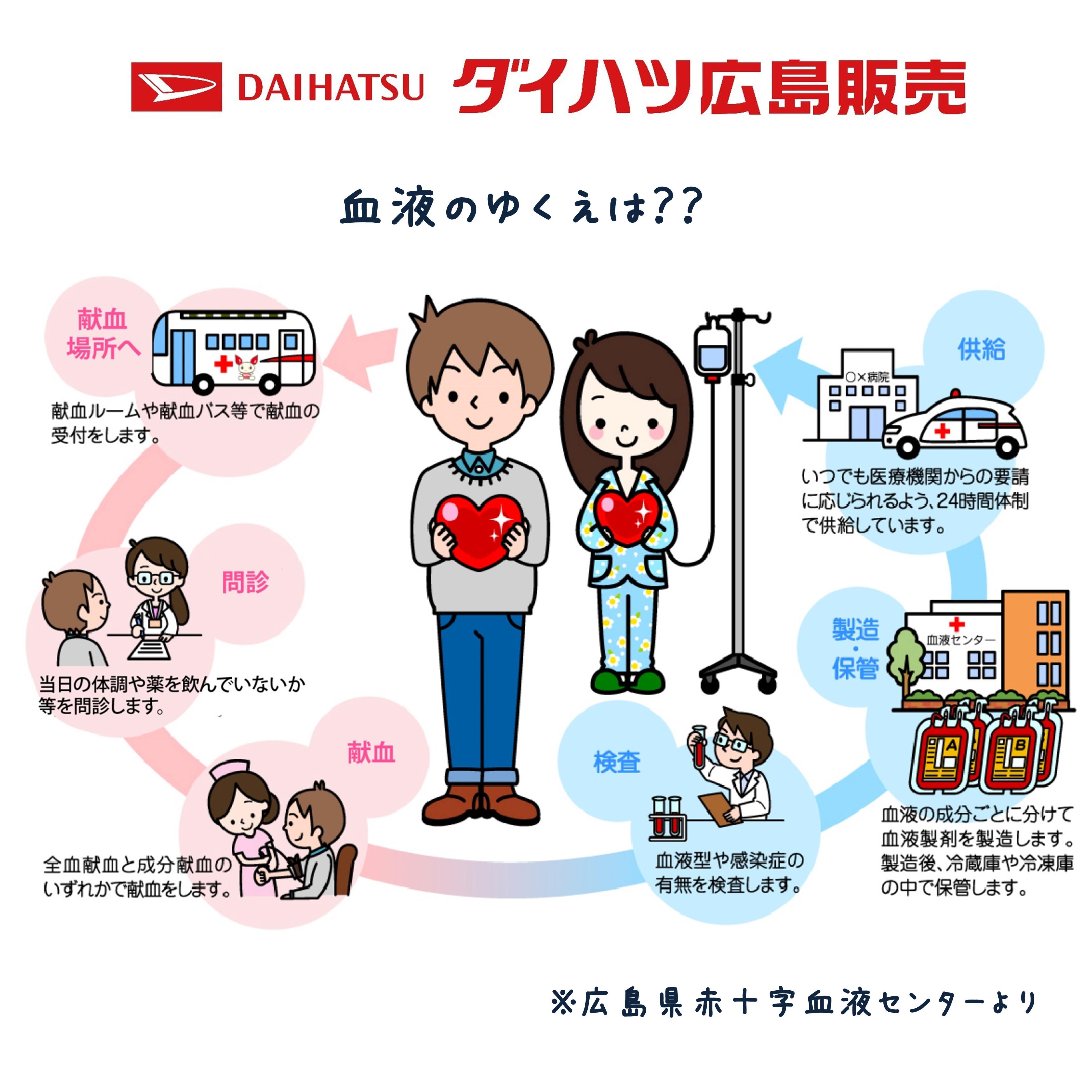 CSR 地域密着活動 福山三吉店に献血バスがやってきます!献血にご協力ください。 2021-07-20 8月5日(木)ダイハツ広島の福山三吉店に献血バスがやってきます。 現在、コロナウイルスの影響で献血者が減少している様です。 是非この機会に献血のご協力をよろしくお願いいたします。 献血した血液はどうなって患者さんまで届くのかご存知でしょうか? ご協力いただきました血液はこのような流れで患者さんへ届きます。 献血を受けるには基準があります。 年齢・体重・体温等々。 詳しくは広島県赤十字血液センターHPにてご確認ください。 前の記事へ 一覧に戻る 次の記事へ