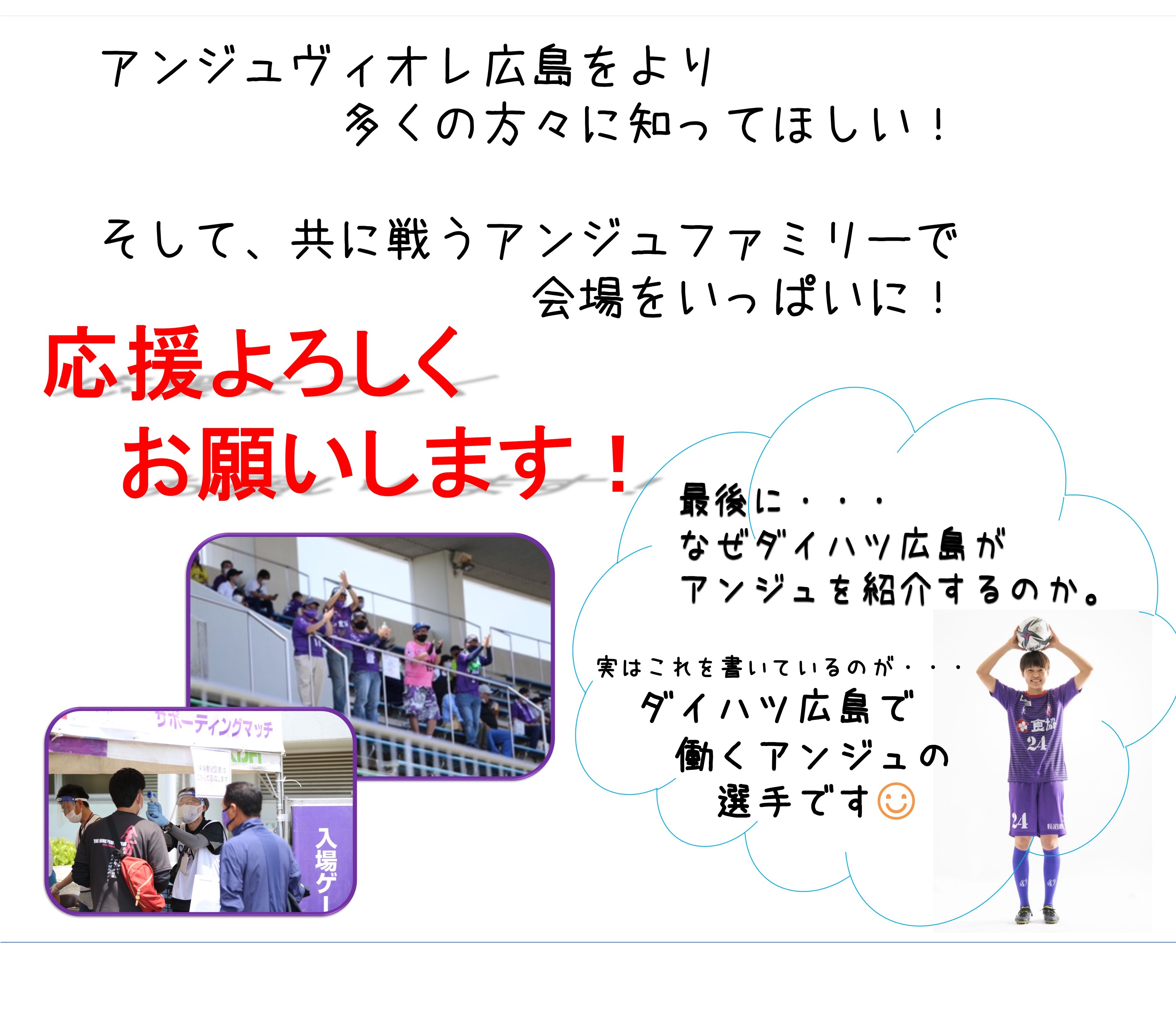 CSR 地域密着活動 アンジュヴィオレ広島紹介 2021-07-23 アンジュヴィオレ広島について紹介します。 拠点は横川で横川駅を降りるとこの大きな横断幕が! アンジュ電車もはしってます! 車内アナウンスは選手が担当! そして、2021年のスローガンは頂10です。 私たちはなでしこリーグ1部という舞台で 頂10達成に向けてスタッフ4人、選手27人で戦っています! 環境は決して良いとは言えない現状です。 ですが、与えられた環境で毎日切磋琢磨して頑張っています! 最後に・・・ たくさんの応援宜しくお願いします! そして、ぜひ会場に足を運んでいただけたらと思います! 前の記事へ 一覧に戻る 次の記事へ