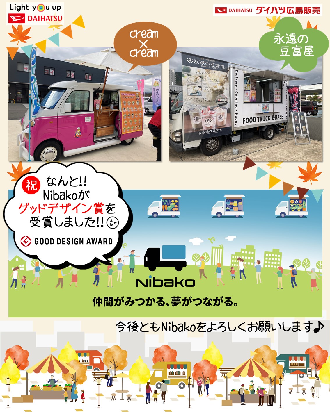 爽やかな秋空の下、Nibako6台が並ぶこの「Nibakoマルシェ」、今回も様々な企業様や団体様にNibakoを使っていただけました😄