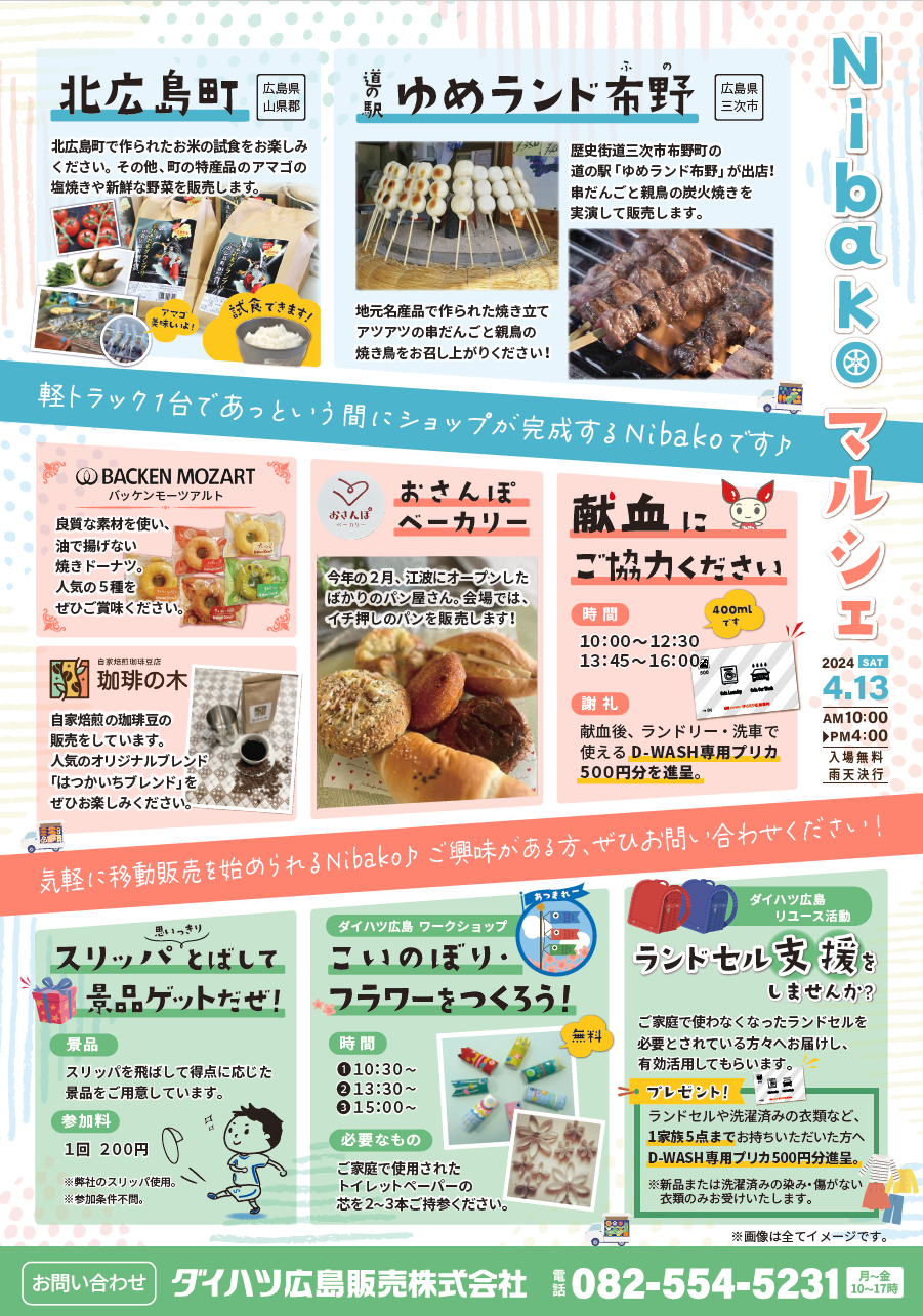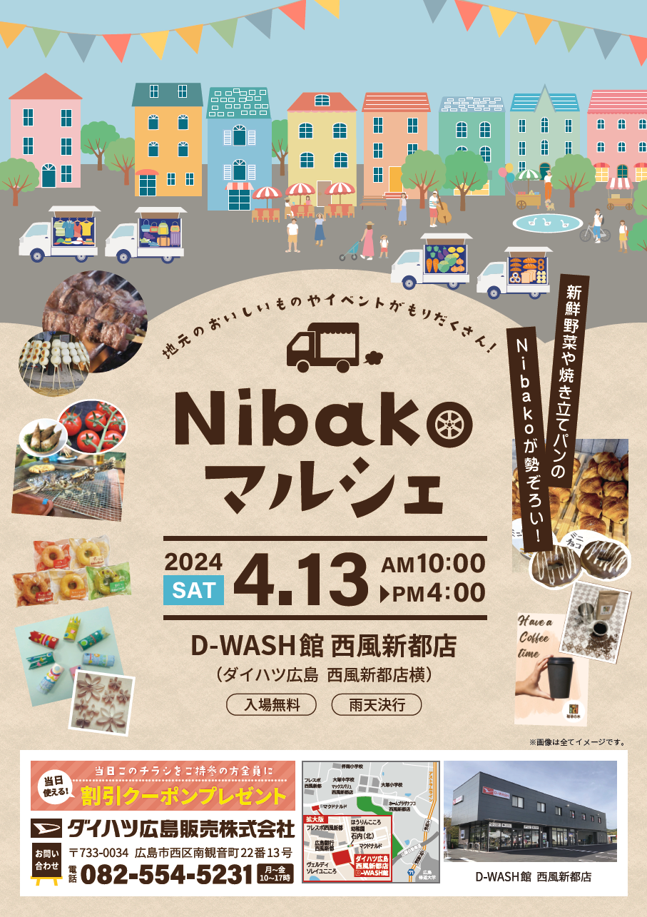 佐伯区石内にあるD-WASH館 西風新都店にてNibakoマルシェを開催します。