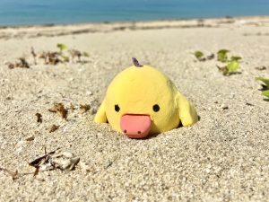 土に還る環境に優しい紙粘土で作ったひよこ等の工作を海岸に9個隠し、宝探しをしながら楽しく清掃活動を開始!