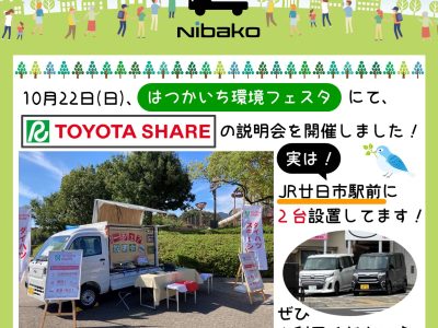 【Nibako】カーシェア説明会を開催しました! 2023.10.27 10月22日(日)、「はつかいち環境フェスタ」にて、「カーシェア説明会」を開催しました🚙🚗 またまた […] ダイハツ広島販売(株)本社