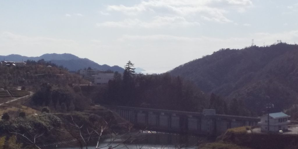 梶毛ダム越しにみえる海と島、、、、おそらく方向的には五日市か廿日市じゃないかと。
