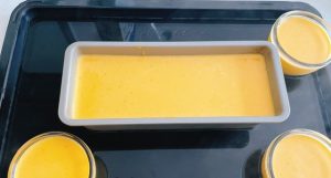 型へ流して湯煎をはった天板に入れてオーブンへ!