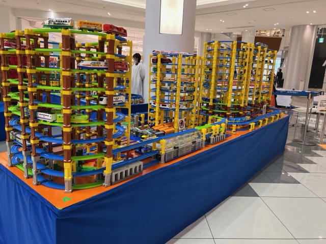 大量のプラレールを走らせている展示ブースと実際にレールをつなげて遊べるブースと別れており、