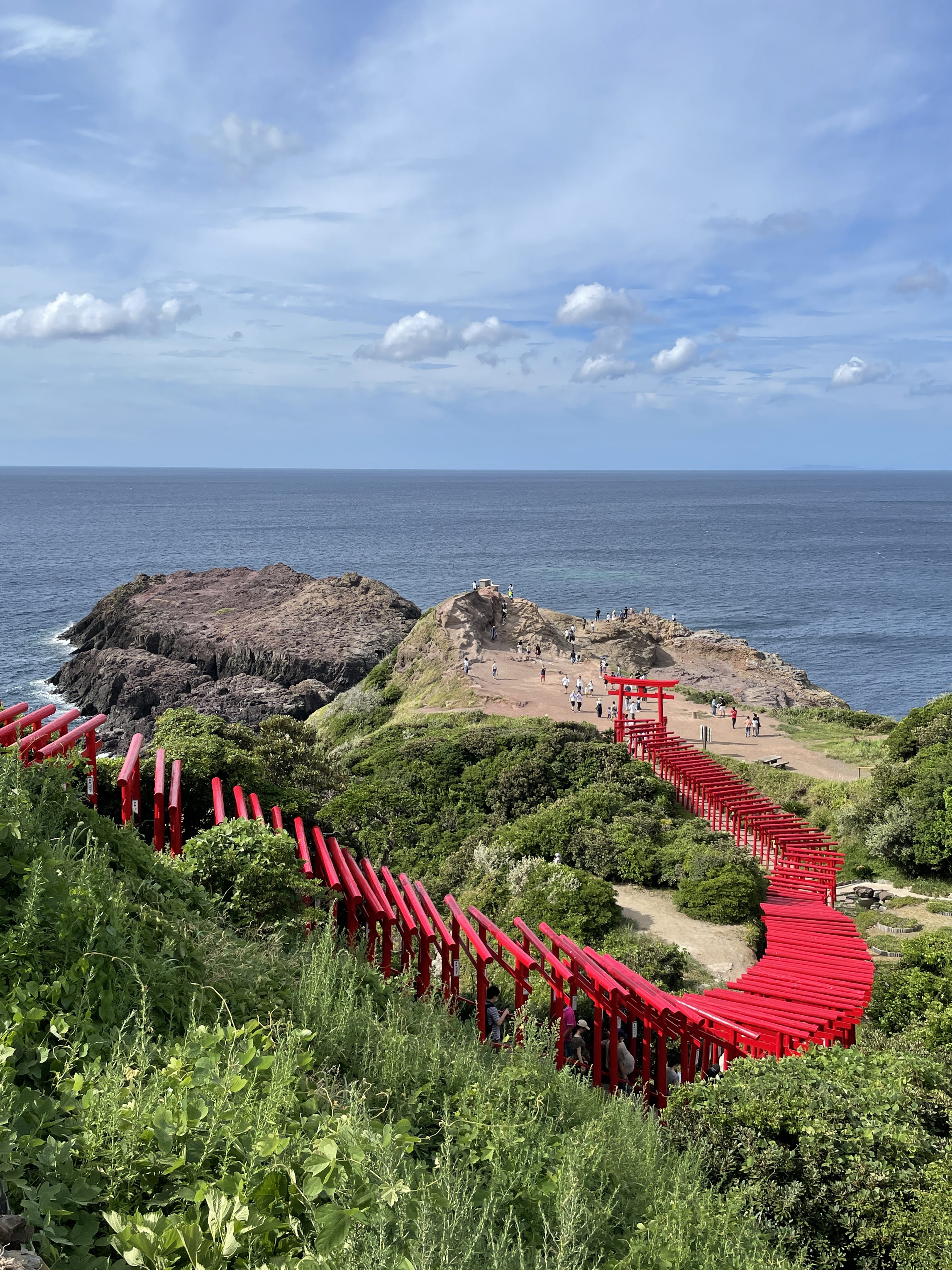 長い長い真っ赤な鳥居を海に向かって進むと、その先は断崖絶壁!!
