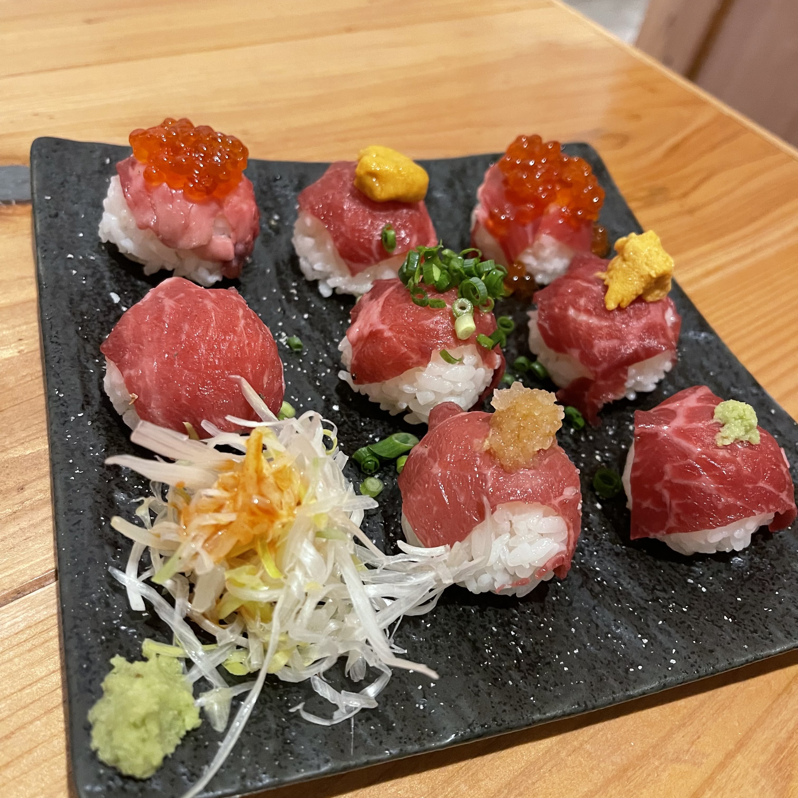 ウニやイクラが乗った映え肉手毬寿司🍖