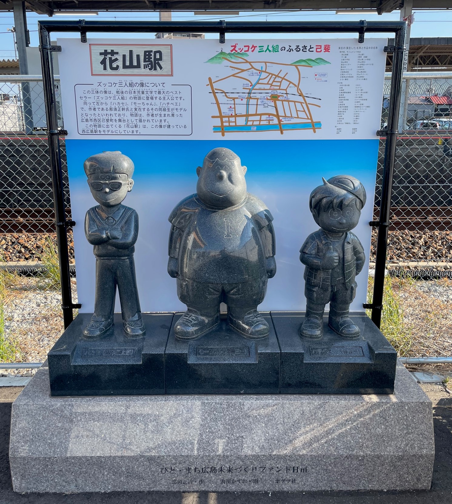 ズッコケ三人組の像が