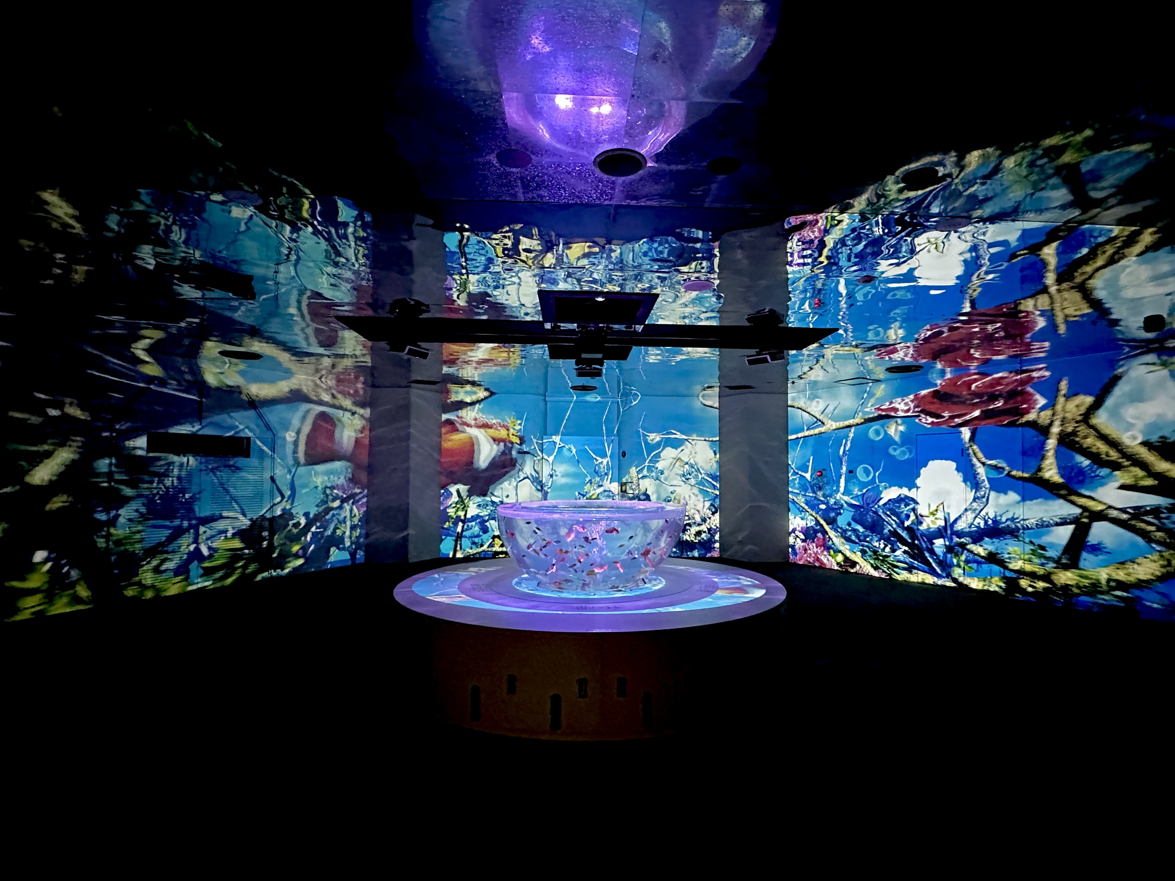 中に入るとすぐ金魚。プロジェクションマッピングがきれい✨