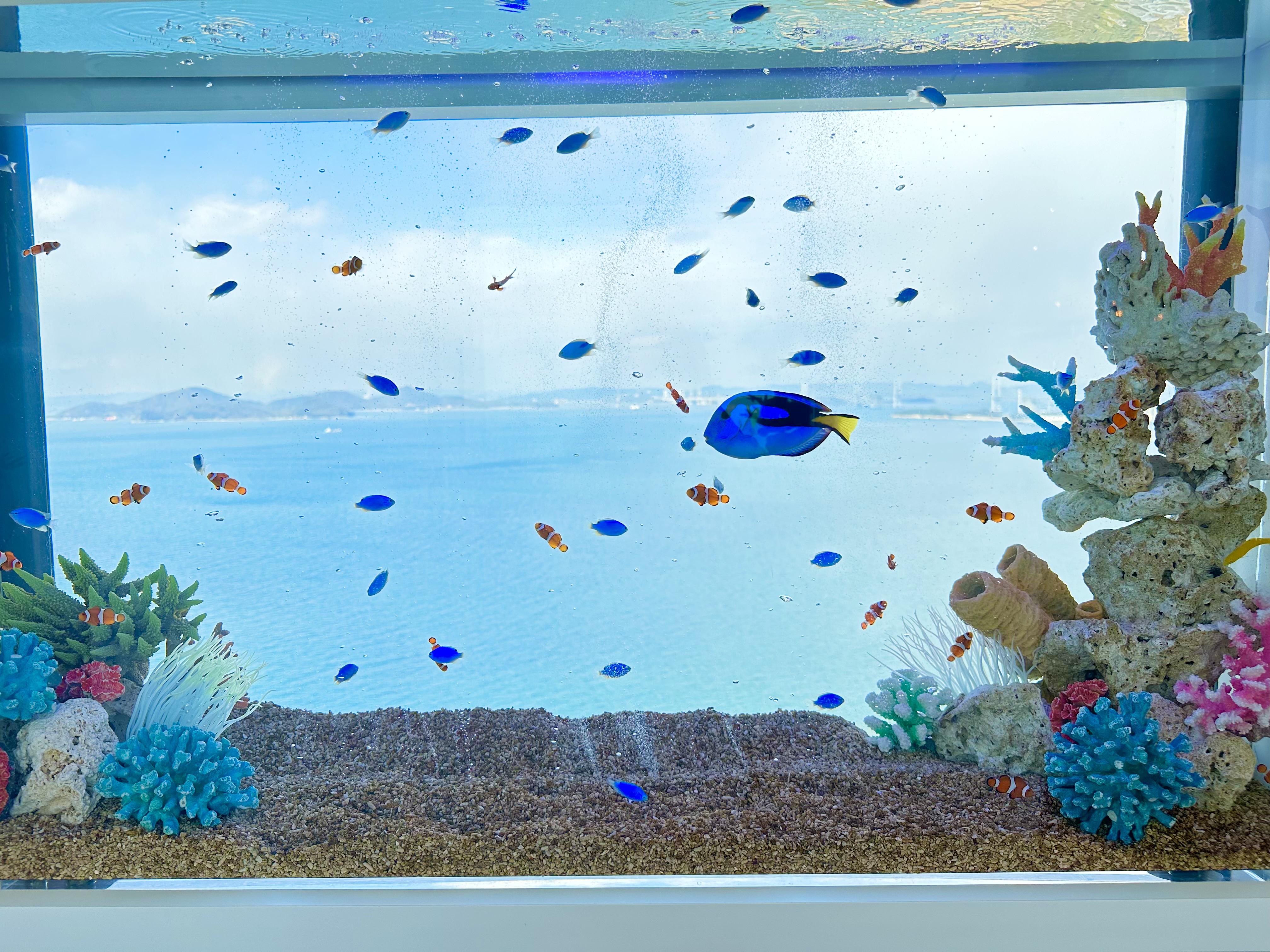 え、金魚浮いてる?と思ってしまうこちら、水槽が窓に展示されています。