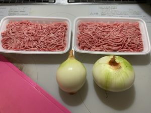 玉ねぎとひき肉に塩コショウ・ウスターソース・ケチャップなどで味付け。