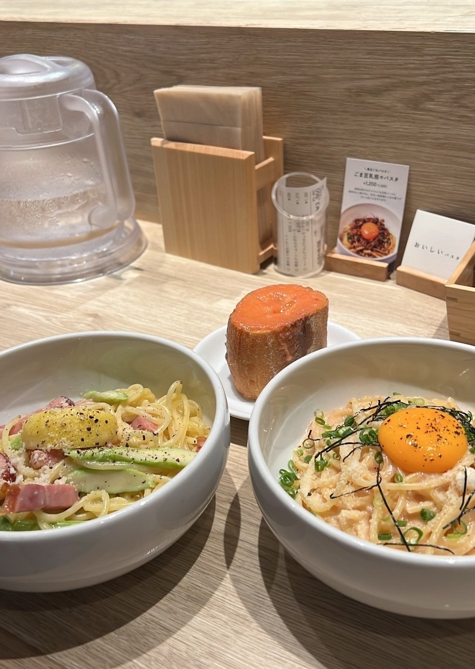 私はベーコンアスパラのレモンクリーム、一緒に行った友だちは明太クリームカルボナーラを注文し、2人で明太バゲットを注文しました🙌