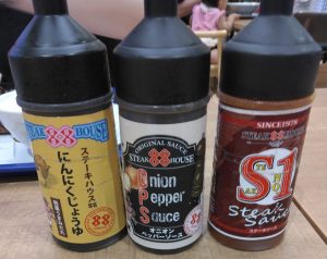 左から、にんにくじょうゆ・オニオンペッパー・88ステーキオリジナルソース。