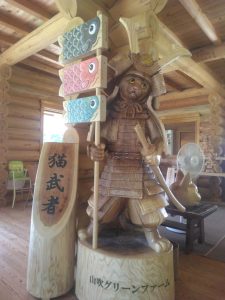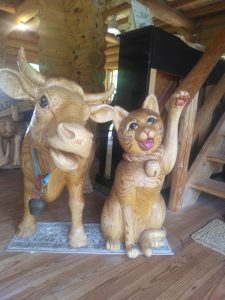 こちらのカフェ、ログハウス風の飲食スペースにはたくさんの木彫りのオブジェが並んでいました。