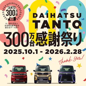 News 最新のニュース お知らせ タント300万台感謝祭り 2025-10-06 2025.10.1~2026.2.28 タント300万台達成記念! キャンペーン期間中、 豪華賞品が抽選で当たるかも!? 詳しくは(こちらから) 前の記事へ 一覧に戻る 次の記事へ