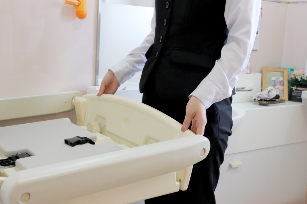 女性用お手洗いには、おむつ台をご用意しております。小さなお子様をお連れのお客さまも安心してご利用いただけます。