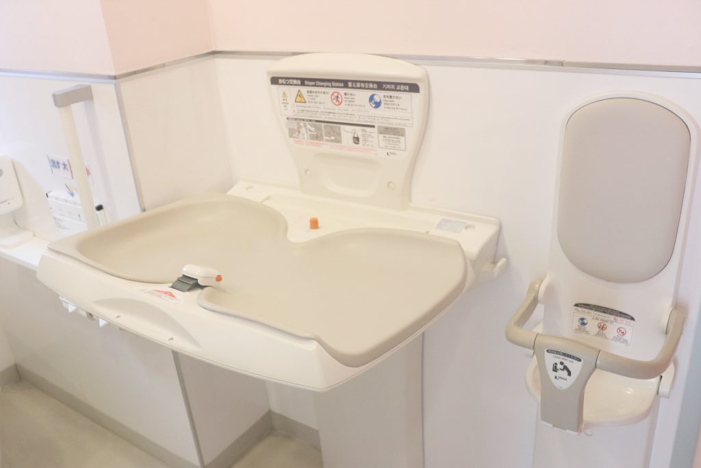 女性用お手洗いにはおむつ交換台を設置し、男性用お手洗いにもベビーチェアを設置しております。 小さなお子様をお連れのお客さまも安心してご使用いただけます。