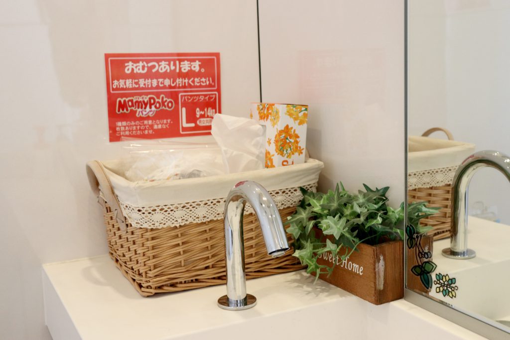 おむつ交換台を設置しており、おむつもご用意しています。お気軽にスタッフまでお申し付けください。